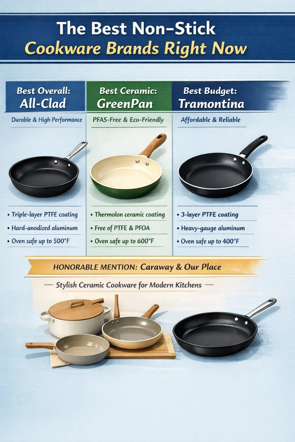| GreenPan | ceramicăa (Thermolon) | 40 USD – 120 USD | Până la 600°F | Selectați modele | Bucătari fără PFAS, conștienți de mediu |